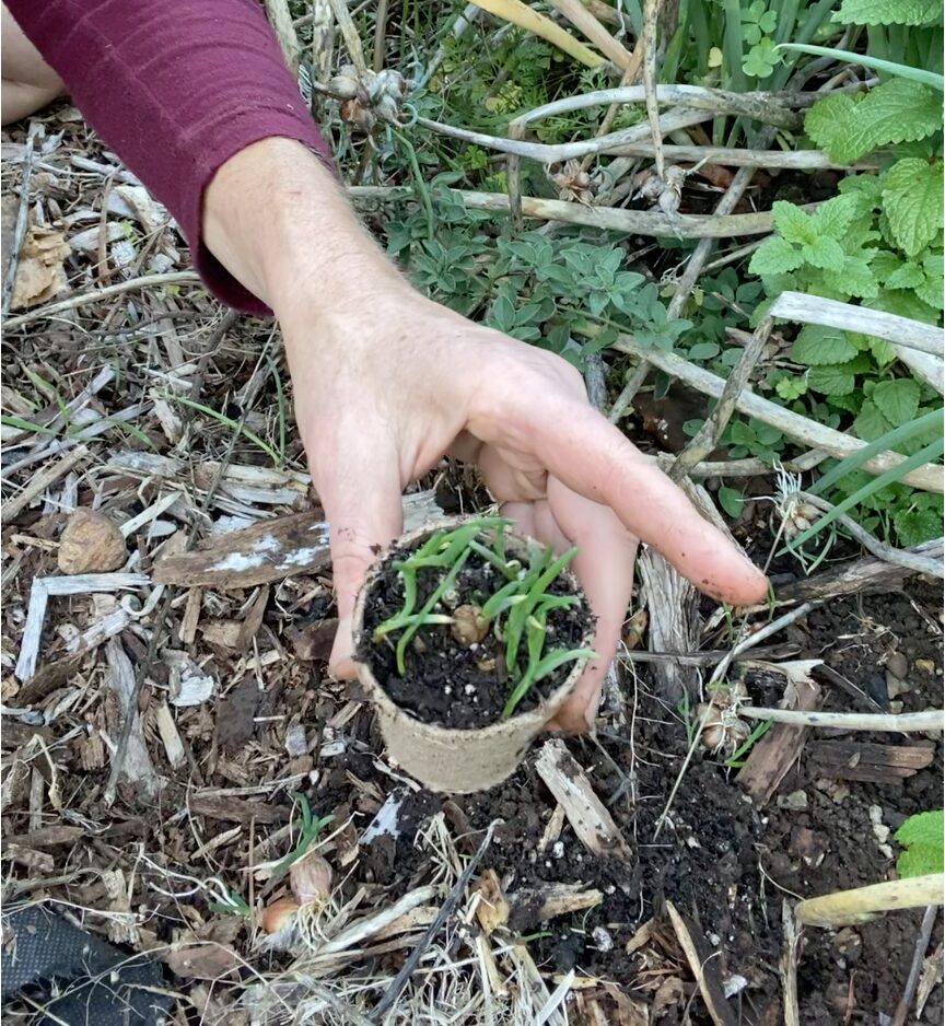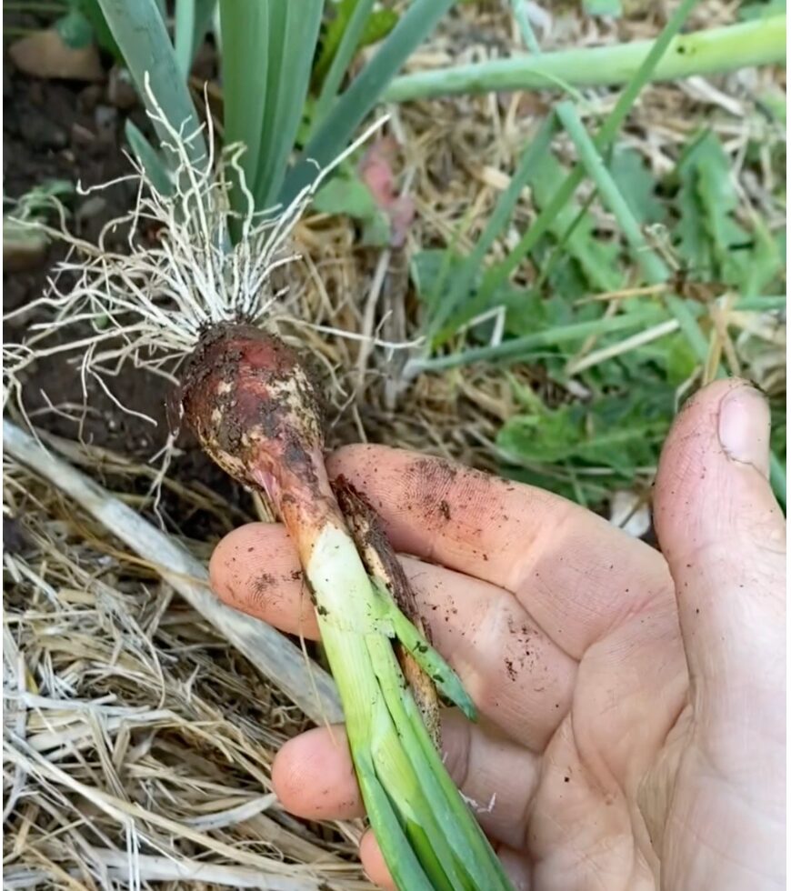 These scallion type onions are tender and delicious in the spring and fall. Just dig up a couple bulbs as needed. They area mild green onion, like a scallion, sometimes with a purple color.